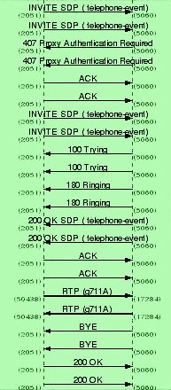 Tengamos el siguiente ejemplo de una llamada SIP, cuya evolución se puede ver (con algo de dificultad) en la imagen de la izquierda, obtenida de una captura de datos: